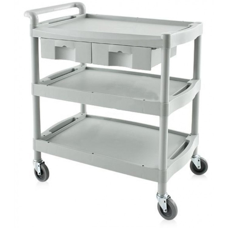 Chariot avec 3 plateaux, 2 tiroirs, très résistant, livré avec 4 roulettes en caoutchouc, pour être en mesure de le déplacer rapidement. Les matières sont : EBS (acrylonitrile-butadiène-styrène) et PP (polypropylène) et a une capacité maximale de 10 kg.