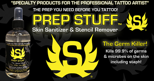 Prep Stuff ™ doit etre appliquer sur la peau avant le tatouage ! Il tue 99,9% des germes et des microbes, y compris le staphylocoque.